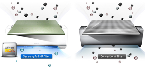 Mantené tu casa limpia y fresca con el filtro de alta densidad de Samsung, que quita hasta las partículas de polvo más pequeñas y elimina la contaminación del aire. Para tu comodidad, la limpieza del filtro es muy sencilla: sólo tenés que enjuagarlo con agua.