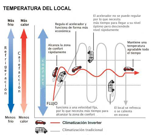 -Mayor nivel de confort: cuando se alcanza la temperatura deseada, los sistemas de aire acondicionado con tecnología Inverter se van adaptando en todo momento a nuestras necesidades dando más o menos frío y manteniendo la temperatura deseada de forma constante.